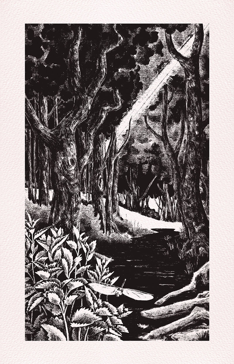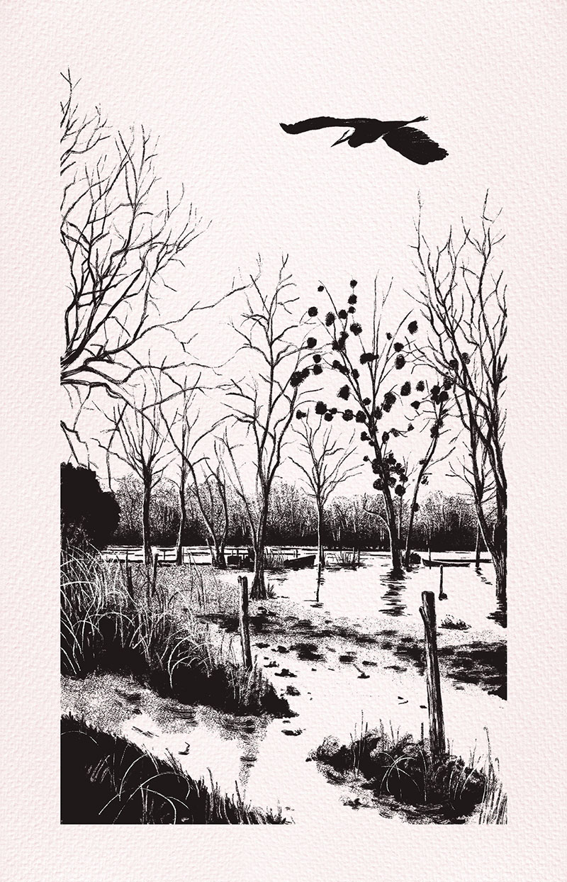 «Entre deux eaux» redessine le parcours d’un personnage imaginaire de la fin du XVIIIe siècle, entre l’Erdre et la Loire. À travers son regard, des vallons aux marais, des plaines aux forêts, on découvre une nature encore luxuriante et vivante, bien qu’en partie modelée par la main de l’homme.